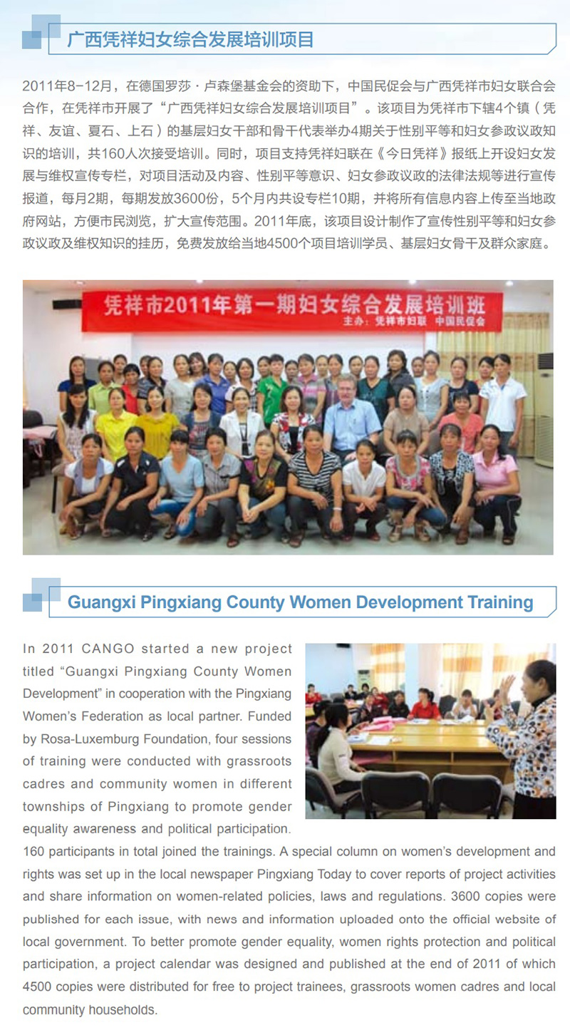 CANGO has been focusing on gender equality advocacy for different stakeholders such as government departments, social organizations, enterprises, media, communities and families. We have carried out gender equality training for women's and children's working committee member units, grass-roots women's federations and women cadres in Qinzhou, Tiandeng, Pingxiang, Chongzuo, Fusui and other places in Guangxi Zhuang Autonomous Region. Also, a special column on women's development and rights protection has been established in local newspapers and periodicals to actively publicize policies and regulations and encourage women to participate fully in the construction of social development. We carried out a project on women's development and health education in Zhenyuan County, Gansu province, with women's health as the entry point and cultural activities as the bond, combined with gender awareness promotion and leadership training for women cadres. A series of projects in Inner Mongolia Autonomous Region, Xinjiang Uygur Autonomous Region and other places were carried out to promote women's rights and interests and propel women's participation in community development, including the protection of traditional culture, reproductive health, health and legal rights protection. Together with social organizations and relevant government departments, we promoted gender equality among policy makers, legal and educational workers, grass-roots community workers, social organization representatives and other groups to carry out related work in Heilongjiang, Shaanxi, Inner Mongolia Autonomous Region, Henan, Sichuan, Gansu, Qinghai, Hainan and other places.