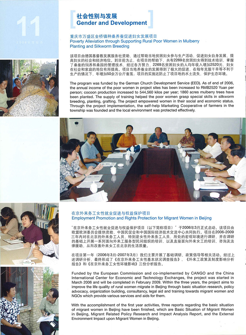 From 2004 to 2009, CANGO organized poverty-stricken women and ethnic minority women in Chongqing, Shaanxi, Henan, Xinjiang Uygur Autonomous Region and Inner Mongolia Autonomous Region to learn embroidery, mulberry planting and silkworm breeding, conducted training on tea, chestnut, walnut cultivation and marketing and offered training on starting-up business, employment and community-based medical services; From 2001 to 2018, 21 training sessions were held in Hami, Turpan and other places in Xinjiang Uygur Autonomous Region for practical skills such as jujube, wild fungus and cantaloupe cultivation, it has provided 22 training sessions on vocational skills such as embroidery, cooking, housekeeping and cleaning, and set up 30 women's associations and mutual-aid groups, providing direct assistance for over 4,500 poverty-stricken women in the rural area and of ethnic minority.